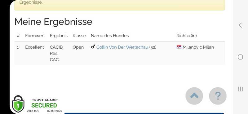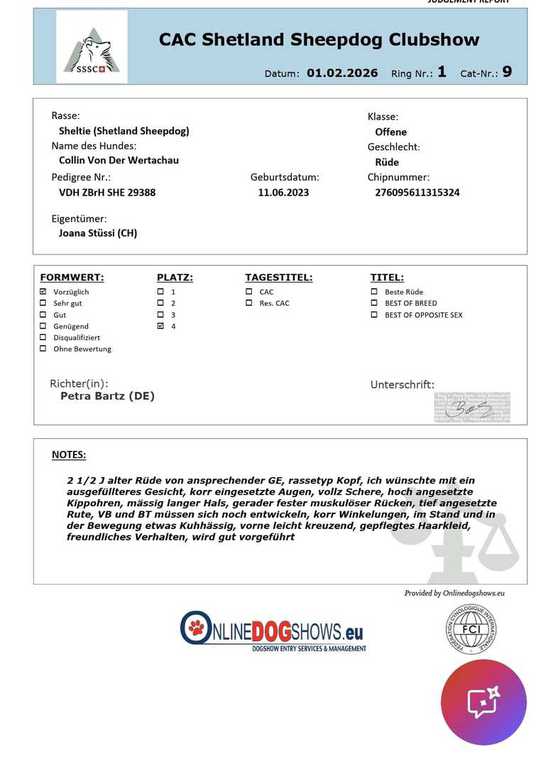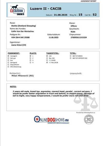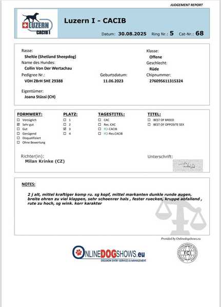 Ausstellungsergebnisse vom 31.08.2025 Offene Klasse in Luzern Sg3, weitere in 2025 2x V, Clubshow am 01.02.2026 V4,